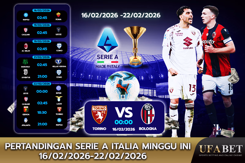 - SSC Napoli vs. Torino FC: SSC Napoli bertemu dengan Torino FC pada Stadio Diego Armando Maradona, 02:45 GMT+7.